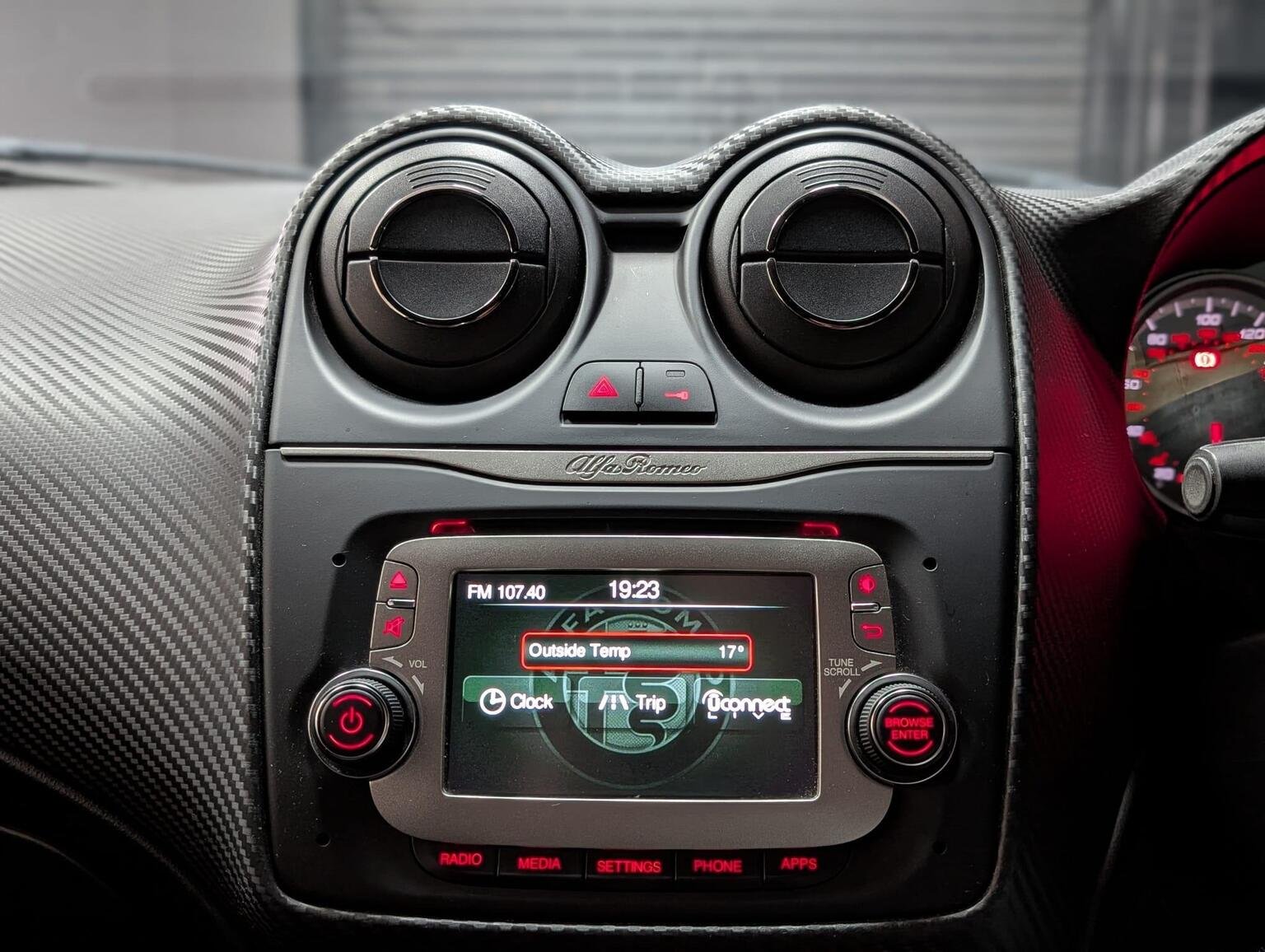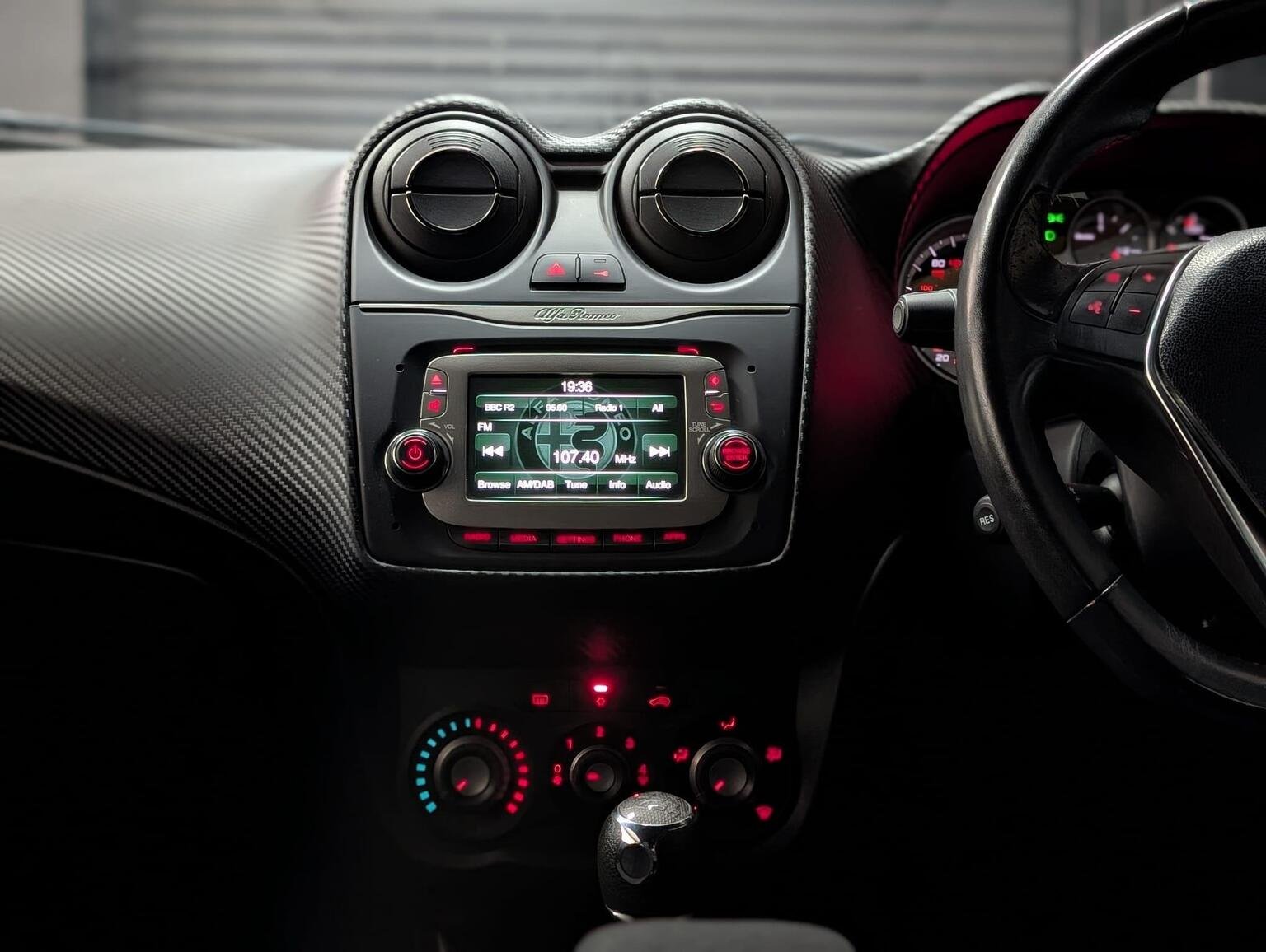 17in Alloy Wheels - 5 Hole Design - Darkened, 7 Airbags, Alfa Code Immobiliser and Alarm System, Alfa DNA - Vehicles Dynamic Control Switch, Aluminium Sports Pedals and Footrest, Body Coloured Bumpers, Brake Calipers - Red, Carbon Fibre Finish Headlight Surrounds, Chrome Effect Window Sills, Climate Control - Manual, Comfort Pack, Cruise Control, Dark Glossy Wing Mirror Surrounds and Door Handles, Dark Tinted Rear Privacy Glass, EPS - Electric Power Assisted Steering, Electric Windows - Front, Electrically Adjustable and Heated Body Coloured Wing Mirrors, Exhaust Tailpipe - Chrome, Flat Bottomed Leather Steering Wheel - Gear and Handbrake with Red Stiching, Front Fog Lights, Kick Plates - Aluminium, Rear Spoiler, Remote Central Locking, Space Saver Spare Wheel, Sports Dials with White Illumination, Sports Rear DAM, TPMS - Tyre Pressure Monitoring System, Uconnect 5in Colour Touchscreen Infotainment System, VDC - Vehicle Dynamic Control
