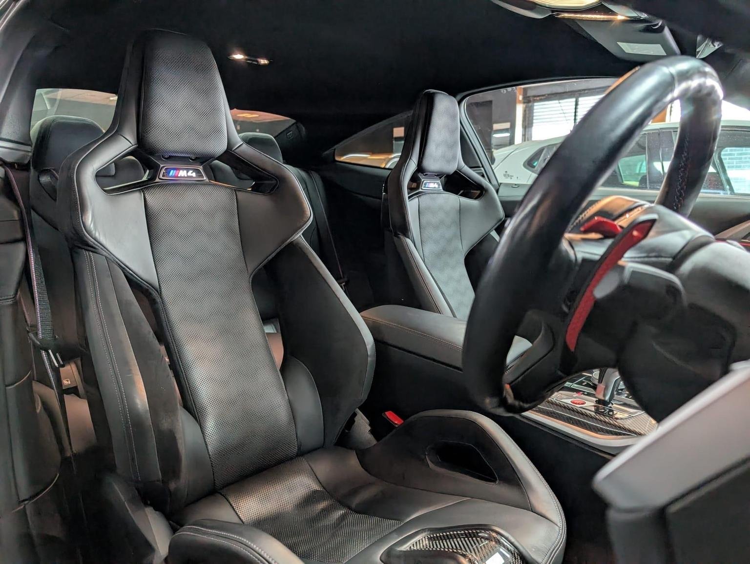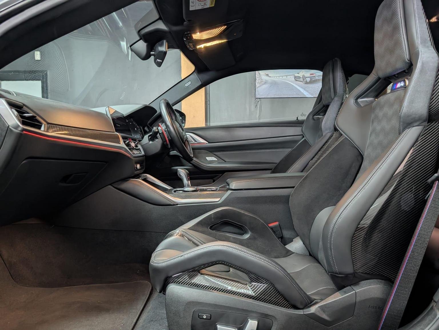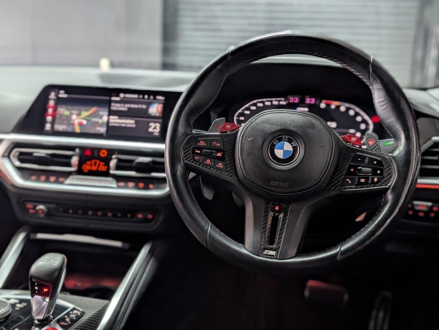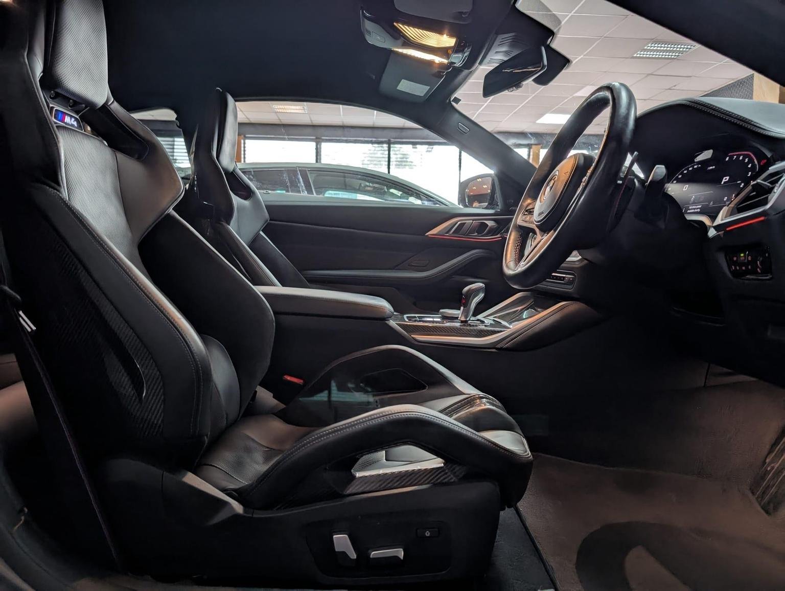 Double-Jointed Spring-Strut Front Axle, Driving Assistant, Driving Experience Switch, Electric Memory Seats, Electric Window, Electronic Differential Lock, Electronic Engine Immobiliser, Enhanced Bluetooth and Wireless Charging, Extended Storage, Exterior Mirror Caps and Rear Spoiler in High-Gloss Black, Exterior Trim - Extended High Gloss Shadowline, Exterior Trim - High-Gloss Shadowline, Floor Mats - Velour, Folding Wing Mirrors with Auto-Dimming, Follow-Me-Home Function, Front Heated Seats, Front Lumbar Support, Front and Rear Apron Plastic in Body Colour, Galvanic Controls, Glove Compartment - Illuminated, Harman Kardon Surround Audio Sound System, Head-Up Display, Headlight Beam-Throw Control, Headlining - Anthracite, Heat Protection - Sun Protection Glazing, High-Beam Assistant, Illuminated Bow-Type Door Handles - in Body Colour - Drivers Side with Door Lock, Interior Trim - Black High Gloss, Interior Trim - Carbon Fibre, LED Rear Lights, Language Version English Handbook, Lower Edges of Bumpers - Side Sills - Edge Binding of Diffuser and Diffuser in Black High-Gloss, Luggage Compartment Lights, M Compound Brakes with Red High Gloss, M Drive, M Drive Professional, M Seat Belts, M Sport Differential, M Sport Seats, M Steering Wheel, Model Badges in Black, Model Logo - Rear Right M4 Competition Inscription, Multifunction for Steering Wheel, Oil Sensor For Level and Grade, Parking Assistant, Parking Brake - Electromechanical, Power Socket 12v, Power Sockets, Rear Backrest - Foldable and Dividable by 40-20-40, Rear-View Mirror with Auto-Dimming, Reversing Light, Roof Aerial Bulge and Roof Mouldings in Black High-gloss, Runflat Indicator, Safety Battery Terminal Clamp, Shifting Point Display, Side Impact Protection, Smartphone Integration, Steering Column Adjustment, Strakes in Front Side Panel - Black Matt-Black High-Gloss with Model Badge, Sun Protection Glass, Sun Visors with Ticket Holder and Illuminated Vanity Mirror, Tailpipe Finishers in Black Chrome, Third Brake Light, Through-Loading System, Tool Kit Located in Luggage Compartment, Tyre Pressure Sensors, Tyre Repair Kit, Variable Sport Steering, Warning Triangle, Washer Jets - Heated, Welcome Light, WiFi Hotspot, 19in Front - 20in Rear Alloy Wheels - M Double Spoke - 826 - Forged - Jet Black with Mixed Tyres, Acoustic Glass, Active Guard Plus, Adaptive M Suspension, Air Conditioning - Automatic with Three-Zone, Airbags, Alarm System, Ambient Lighting, Armrests, Automatic Start-Stop Button, BMW ConnectedDrive Online Services, BMW Emblem on Engine Compartment Lid and Tailgate, BMW Emergency Call, BMW Individual Lights - Shadowline, BMW Kidney - Frameless with Horizontal Double Grille Slates - Black High-Gloss with Model Badge, BMW Live Cockpit Professional, BMW TeleServices, Battery in Luggage Compartment, Bumper System - Front and Rear, Centre Armrest in Rear - Folding with 2 Cup Holders, Centre Lock Switch, Closing System with Central Locking, Condition Based Service, Connected Package Professional, Crash Sensor, Cruise Control including Speed Limiting Function - LIM Button, Cupholder, DAB Radio, DSC - Dynamic Stability Control Plus, Door Sill Finishers with Aluminium Inserts and Model Inscriptions, Door Sill Strips